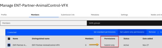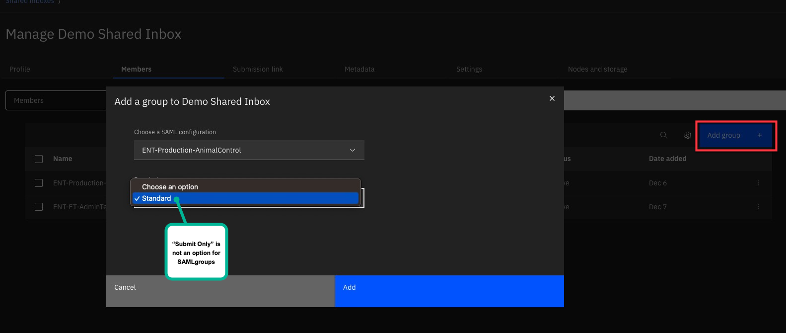 A pre-configured "submit only" group setting instead of "standard" would prevent end users from temporarily having complete visibility into all of the packages within the shared inboxes. This setting is available for when you add individual members, but not groups.